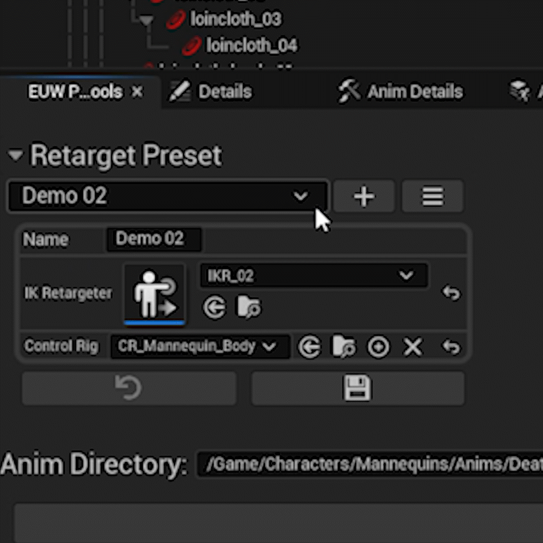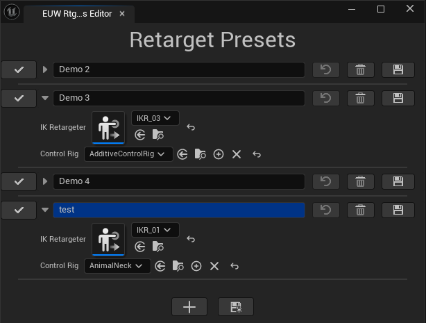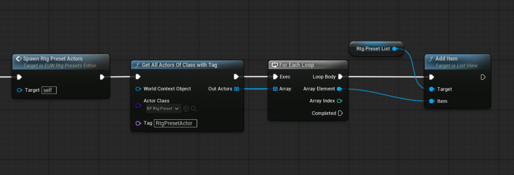 However, the List View Widget I was using to populate the Presets Editor could not directly take retarget preset struct data, so I set up a work around that spawns blueprint actors which act as data containers. The data from these actors are then sent to the Presets Editor Blueprint, and then the actors are destroyed.